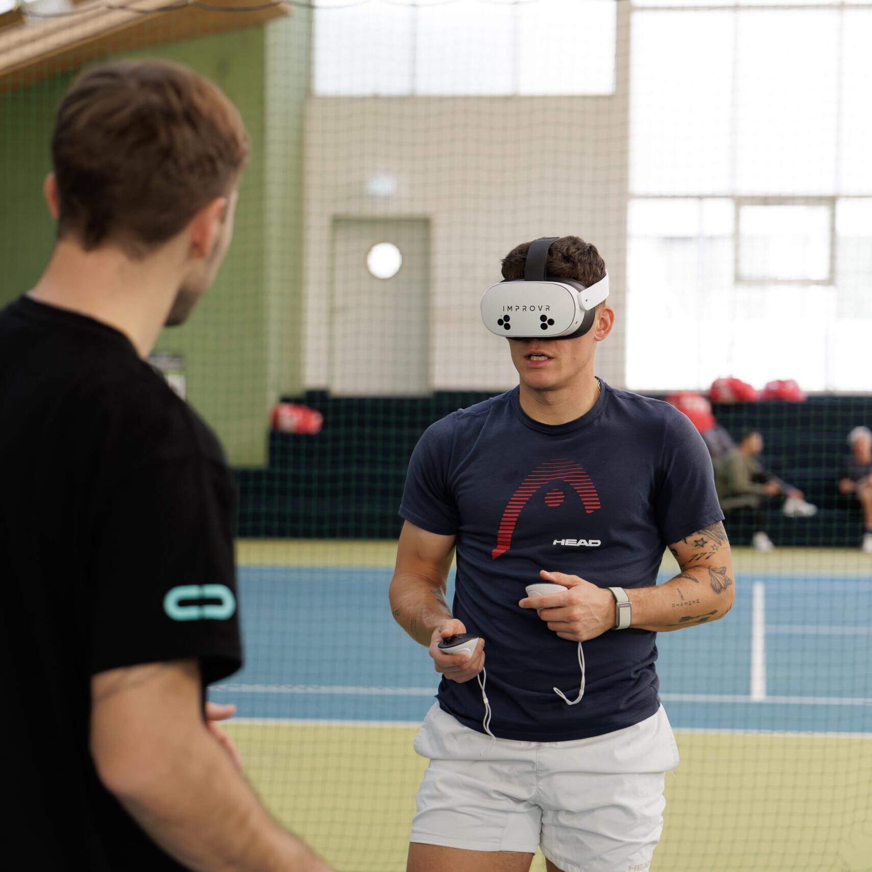Players wear a Meta Quest headset and step into a virtual tennis environment