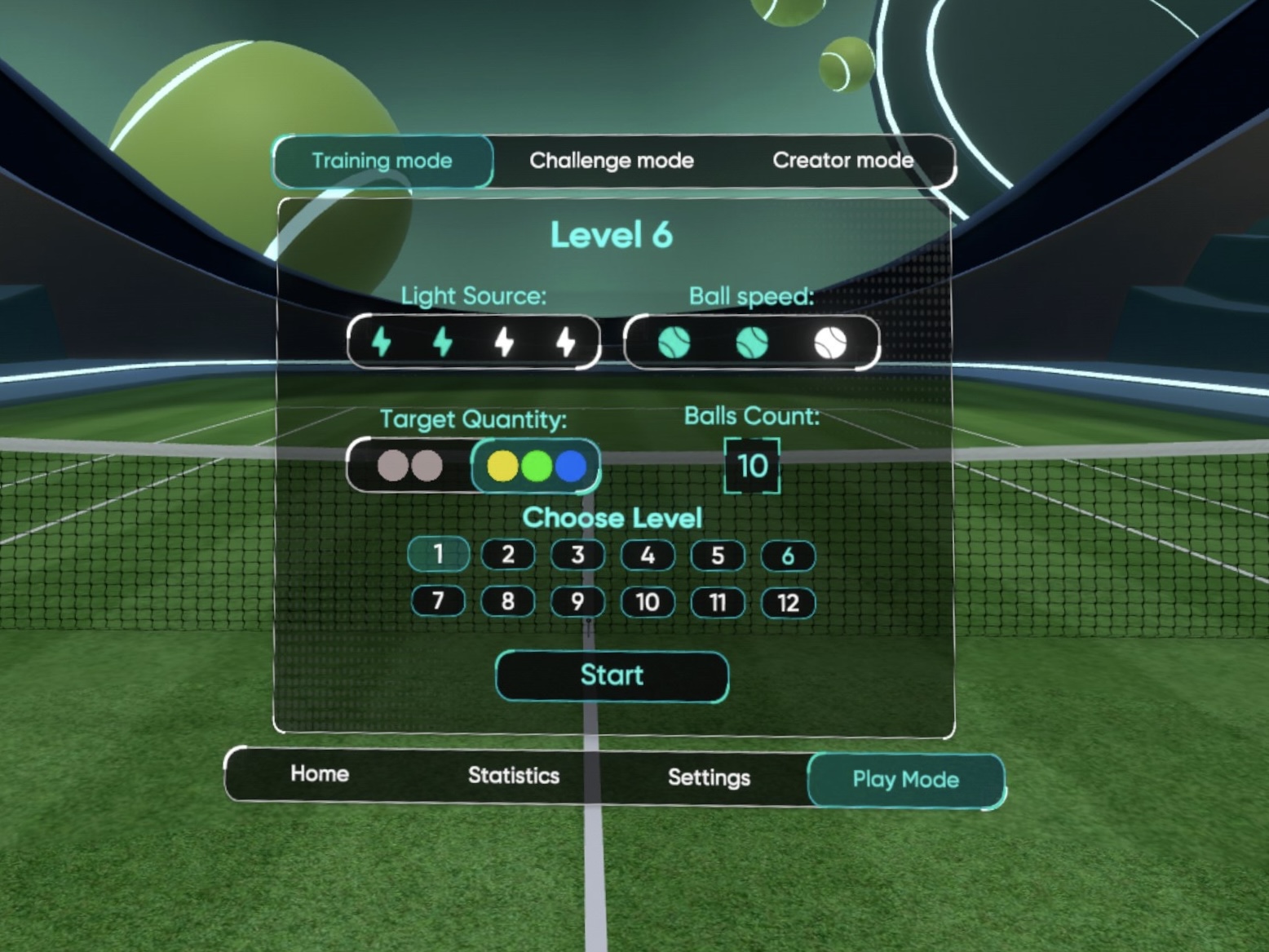 In each session, a colored light signal appears at the end of the court. The player reacts by volleying to the matching target area.